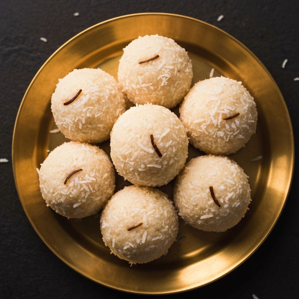 Coconut-rich Kobbari Vundalu made with freshly grated coconut, jaggery, and cardamom.