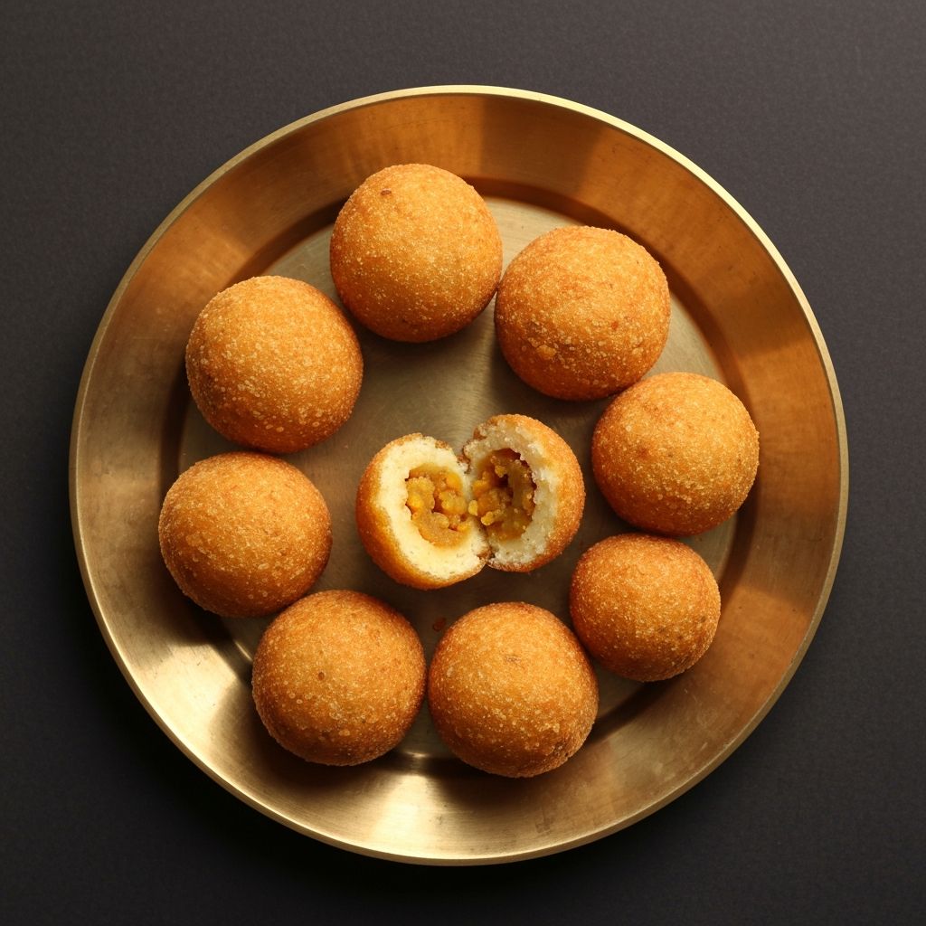 Round, golden Poornam Boorelu filled with sweet chana dal and coconut stuffing.