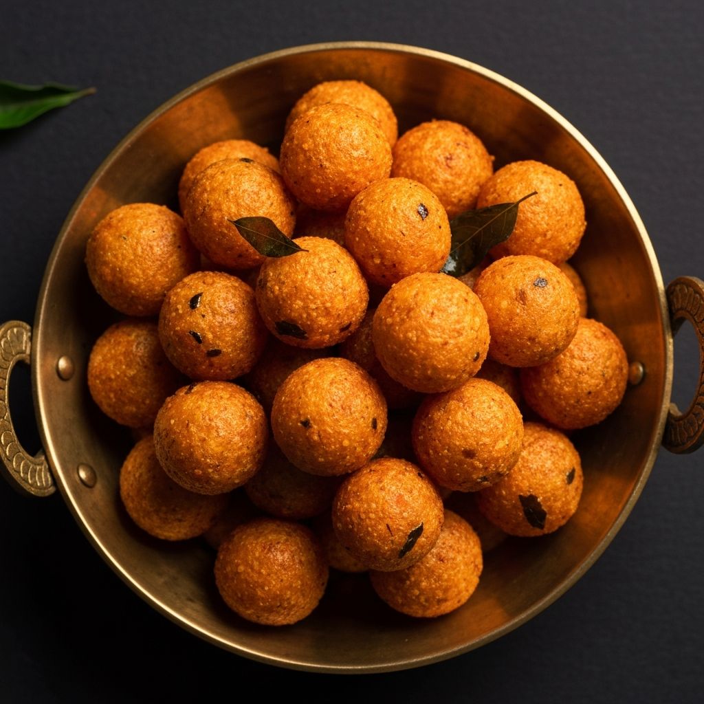 Crunchy Spicy Boondi made with besan, seasoned with red chili powder, curry leaves, and hing.